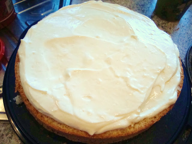 Tässä kuvassa en ole vielä levittänyt reunoille ohutta kerrosta, mutta se pitää muistaa levittää, jotta marsipaani/marshmellow fondant tarttuu siihen.